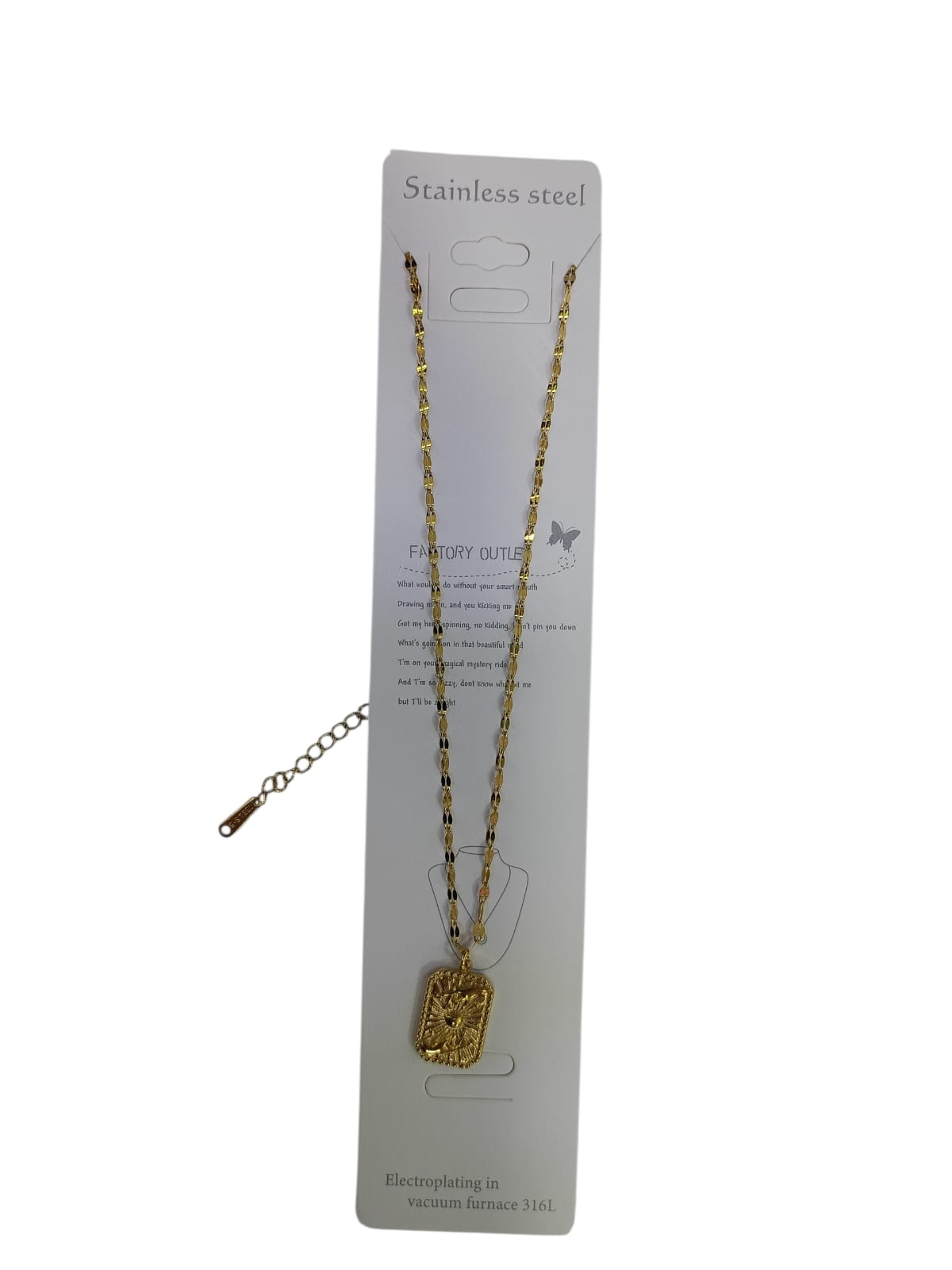 إذا كنت تبحث عن إكسسوار يجمع بين الشكل الفخم والاستخدام العملي، فهذه السلسلة المصنوعة من الستانلس ستيل هي اختيار ممتاز للارتداء اليومي. تأتي بتصميم سلسلة لامعة بلون ذهبي تعطي لمسة عصرية مميزة، بينما تتوسطها تعليقة/ميدالية مستطيلة بارزة بنقشة واضحة تمنح القطعة حضورًا قويًا على الرقبة دون مبالغة.